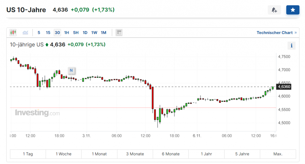 Yield (Rendite)-10jährige US-Anleihe von Freitag und heutigem Montag (Chart: Investing.com)