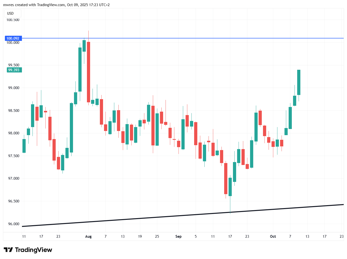 Als Gold über die 4000,- US$ Marke ging, gab der Euro um 0,27% nach. Der USDx stieg um 0,31%. Als heute Silber auf 51,30 US$ kletterte, fiel der Euro um 0,6%, der USDx stieg um 0,5%. Das Chartbild im Titel zeigt es eindeutig. Das Edelmetall steigt nicht in neue Höhen, weil der US-Dollar versagt, es steigt, weil die Korrektur im US-Dollar seit dem 17. September beendet ist.
