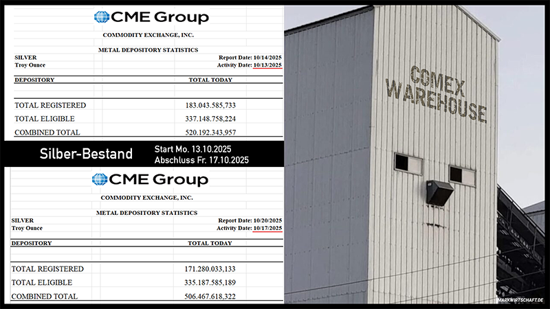 Zu Beginn am Montag, den 13.10.2025 waren 183 Mio. Unzen Silber im Handel, 520,2 Mio. insgesamt im Lager. Mit Handelsschluss Freitag, den 17.10.2025 verblieben noch 171,3 Mio. Unzen im Handel. Der Gesamtbestand schrumpfte auf 506,5 Mio. Unzen.