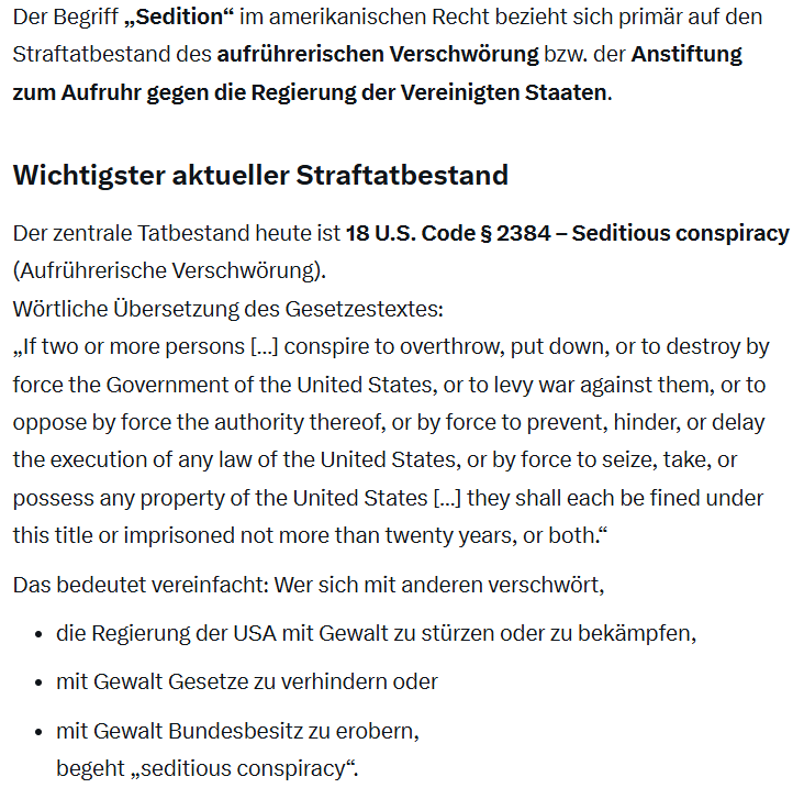 Nach der Freigabe der Epstein-Akten postet Donald Trump bereits vermehrt, "Sedition" strafrechtlich zu verfolgen. Zum besseren Verständnis, Sedition meint im amerikanischen Recht folgenden Straftatbestand: