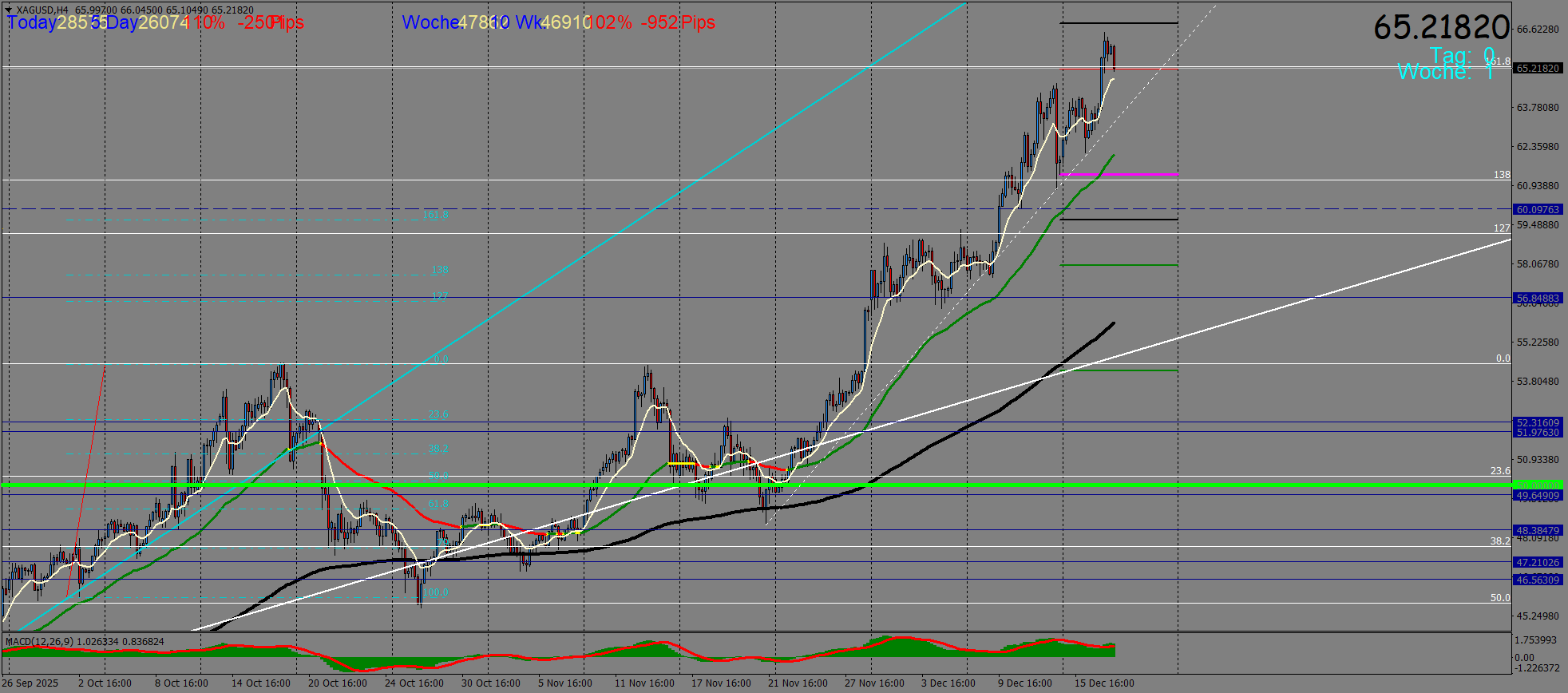 Im Oktober explodierte der historische Becher nach oben, nur um im selben Monat einen Retest des Ausbruches zu veranstalten. Der 4-Stunden Chart zeigt eindrucksvoll, auf welcher Trendlinie Silber in den Ausbruch marschierte und welchen ehemaligen Trend (blau) es nun nach der "Ehrenrunde" wieder versucht zu erreichen.